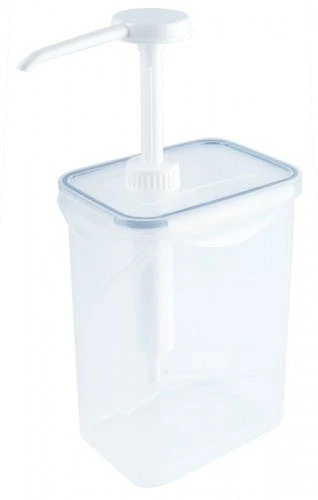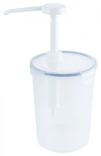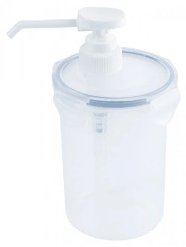 Dispenser, rund mit 30 ml Pumpe mit Pumpaufsatz 1312, leicht zerlegbar, auf verschließbaren Dosen aus transparentem Polypropylen, lebensmittelgeeignet
