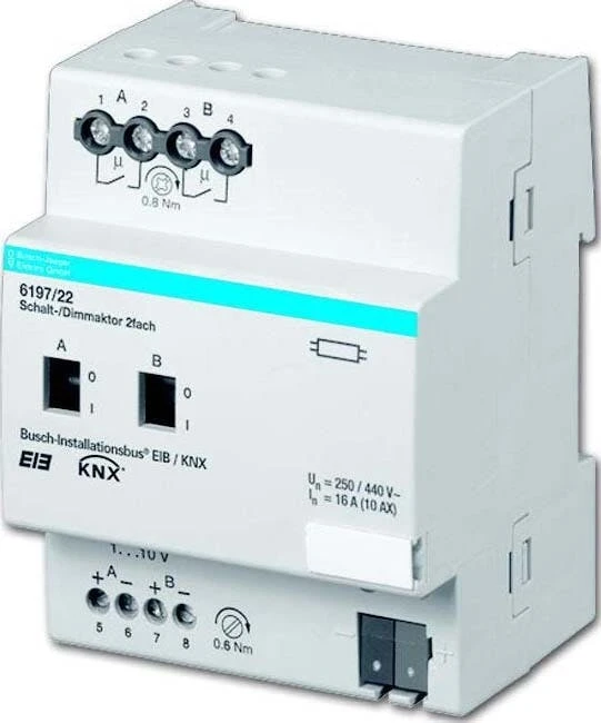 Busch-Jaeger LED-Dimmer 6155/40 Hersteller: Busch-Jaeger Bezeichnung: LED-Dimmer KNX EB-Dimmer Typ: 6155/40 Bussystem KNX: ja Montageart: Einbauinstallation Mit Busankopplung: ja Mit LED-Anzeige: ja Max. Schaltleistung: 100 W Anzahl der Ausgänge: 4 Max. Steuerstrom: 1000 mA Schutzart (IP): IP20Busch-Jaeger LED-Dimmer 6155/40: weitere Details1- 4 Kanal LED-Dimmer für LED-Module mit Konstantspannung. Ansteuerung von RGB oder RGBW-LEDs möglich. Zusammenfassung von 2 x 2 Kanälen zur Ansteuerung von Warm-/Kaltweiß-LED-Stripes. Zusammenfassung von 3 Kanälen zur Ansteuerung eines RGB-LED-Stripes. Zusammenfassung von 4 Kanälen zur Ansteuerung eines RGBW-LED-Stripes. Mit integriertem Netzteil. Bündelung der Kanäle möglich. Integriertes Lastmanagement zur automatischen Anpassung der maximalen Stromstärke pro Kanal in Abhängigkeit der genutzten Kanäle. Master/Slave-Funktion. EAN: 4011395202098 Geliefert wird: Busch-Jaeger LED-Dimmer KNX EB-Dimmer 6155/40, Verpackungseinheit: 1 Stück, EAN: 4011395202098