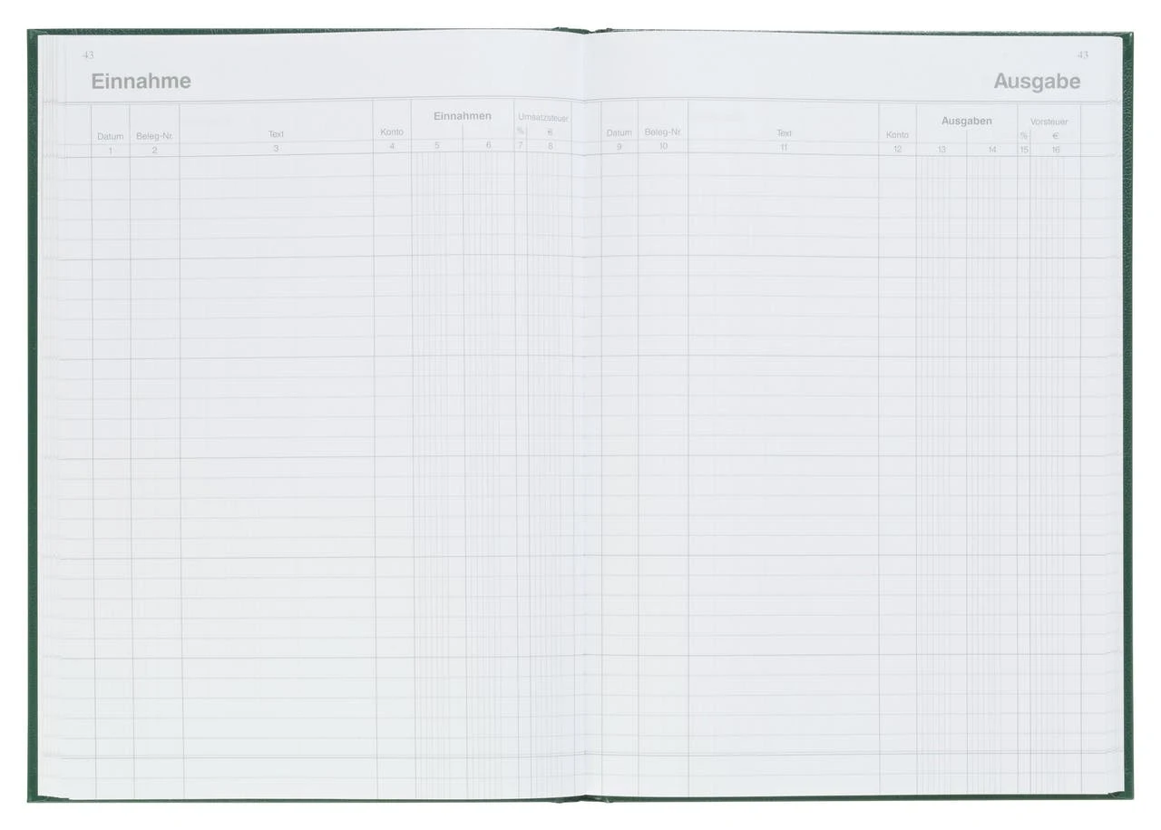 Das Herlitz Kassenbuch in DIN A4 verfügt über 16 Spalten und ist doppelseitig bedruckt, gebunden und nummeriert. Es werden sowohl Einnahmen als auch Ausgaben.