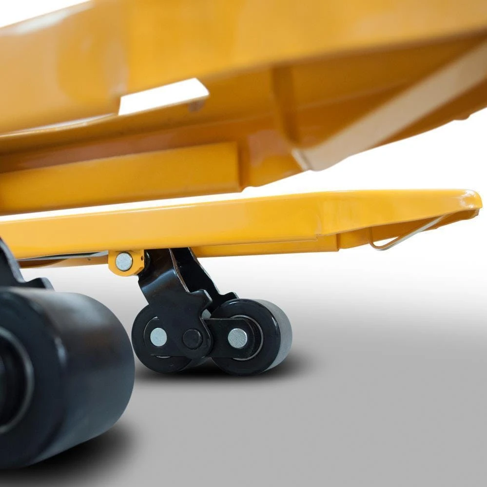 Hochwertige, kugelgelagerte Rollen aus Polyurethan sorgen für Laufruhe und sind sowohl widerstandsfähig, als auch auf verschiedenen Untergründen einsetzbar. Die Lastrollen sind für mehr Stabilität jeweils doppelt ausgeführt (Tandemrollen). Abgerundete Gabelspitzen erleichtern das Einfahren in Paletten. Die wertige Verarbeitung gewährt Funktionssicherheit auch unter Höchstlast sowie wartungsarmen Betrieb und eine lange Lebensdauer.