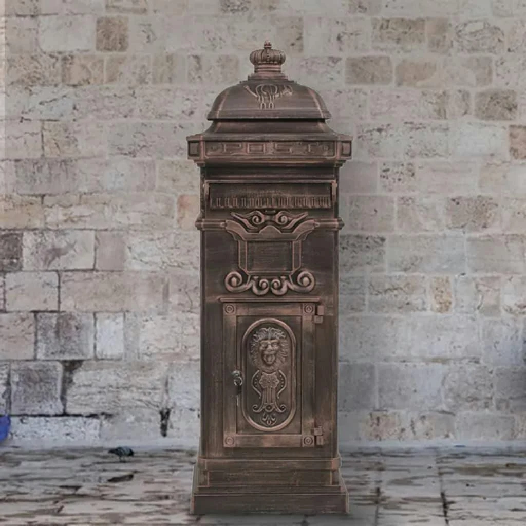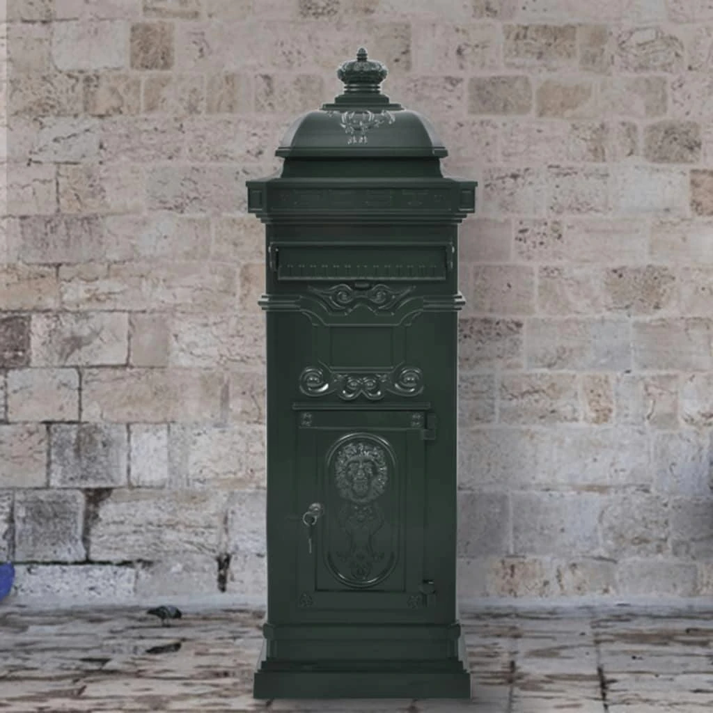 Dieser Briefkasten ist mit einem breiten Briefschlitz mit einer Klappe zum Schutz des Inhalts vor Witterungseinflüssen ausgestattet und verfügt über zwei abschließbare Fächer (2 Schlüssel pro Fach werden mitgeliefert) zur einfachen Entnahme der Briefe. Der Briefkasten ist aus witterungsbeständigem und rostfreiem Aluminiumguss gefertigt und somit bestens für den Außeneinsatz geeignet. Er ist mit einer Fülle von eleganten, im Vintage-Stil gehaltenen Dekorationsdetails verziert und wird so zum echten Blickfang in Ihrer Einfahrt oder Ihrem Eingangsbereich.